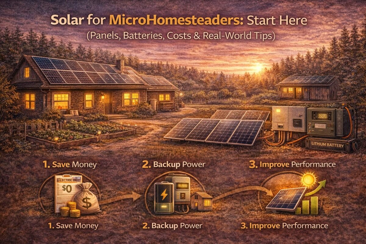 Start here for solar for microhomesteaders: system types, components, costs/ROI, incentives, financing, backup power, and solar for microhomesteaders tips. Simple decision paths + practical tips for real homes.