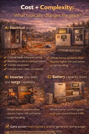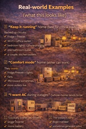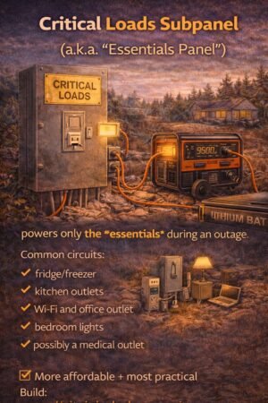 - Critical loads subpanel = back up the essentials (fridge, Wi-Fi, lights, fans, medical). Cheapest + most practical.