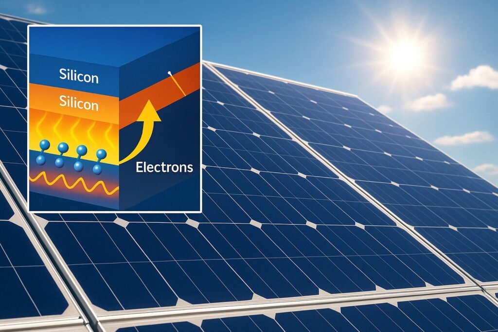 Each solar cell inside your panel is made of two layers of silicon — one slightly positively charged and one slightly negative. When sunlight (photons) hits the surface, it knocks electrons loose in the silicon atoms.