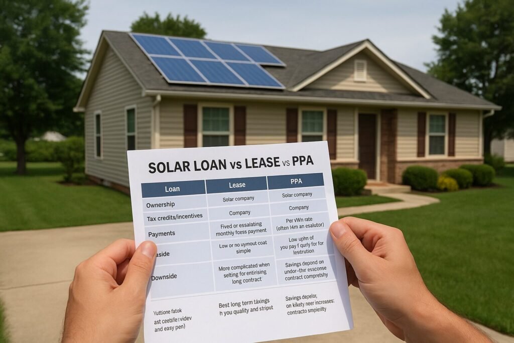 Compare solar loan vs lease vs PPA options, see who owns the panels, who gets tax credits, and which deal delivers the biggest long-term savings.