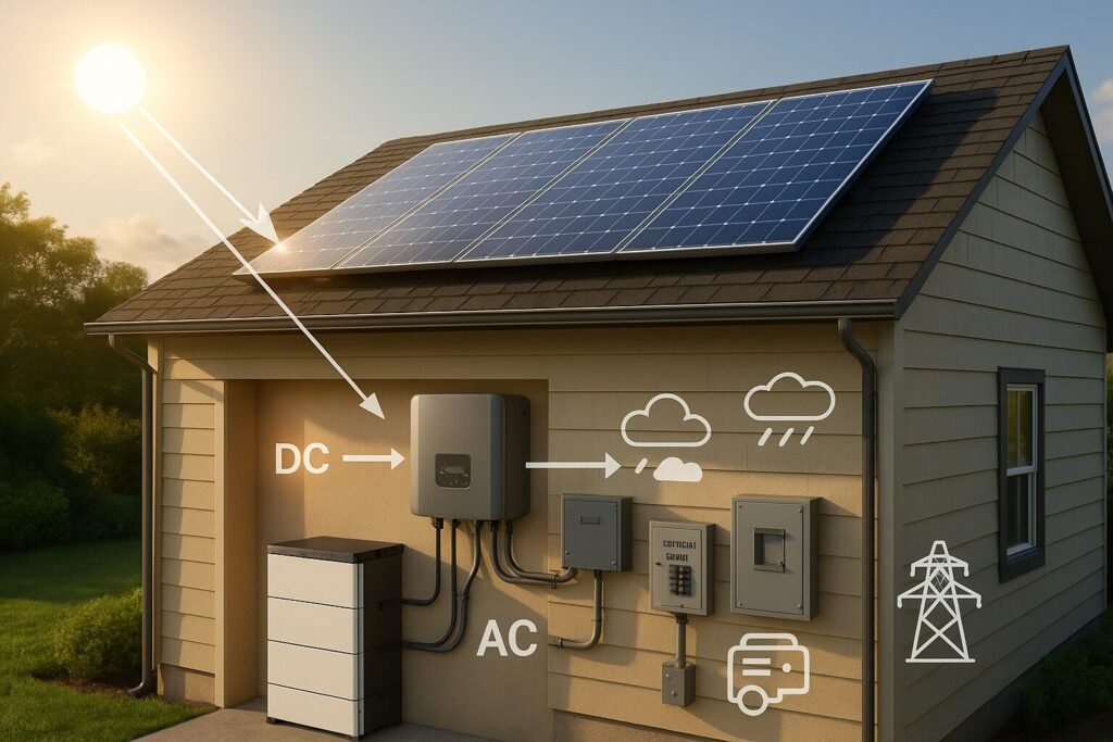 - Hybrid Inverter: one box that coordinates PV, battery, and grid/backup.